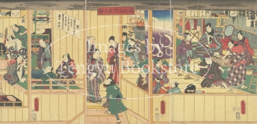 本図は、本来6枚組である作品の上側(楽屋の2階)にあたる3枚。