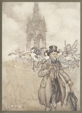 19世紀末イギリスの童話作家J.M.バリー(1860-1937)の代表作「ケンジントン公園のピーター・パン」の挿絵。イギリスを代表する挿絵画家のひとり、アーサー・ラッカム(1867-1939)がイラストをつけた本書は、広く知られているネバーランドのピーターパンの前日譚に当たる物語。ロンドンのケンジントン公園を舞台に、幼いピーターパンと妖精たちの様子が描かれています。