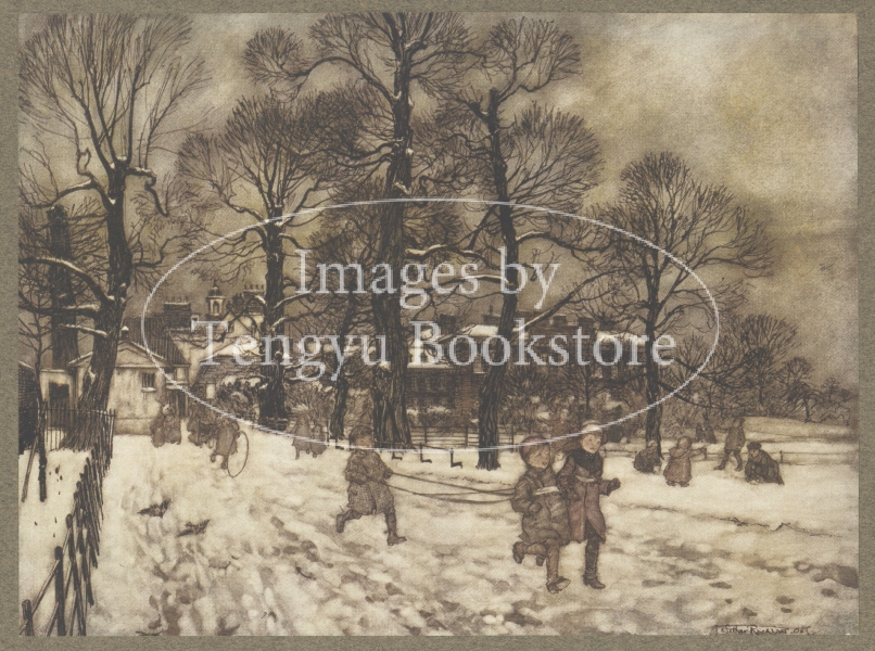 19世紀末イギリスの童話作家J.M.バリー(1860-1937)の代表作「ケンジントン公園のピーター・パン」の挿絵。イギリスを代表する挿絵画家のひとり、アーサー・ラッカム(1867-1939)がイラストをつけた本書は、広く知られているネバーランドのピーターパンの前日譚に当たる物語。ロンドンのケンジントン公園を舞台に、幼いピーターパンと妖精たちの様子が描かれています。