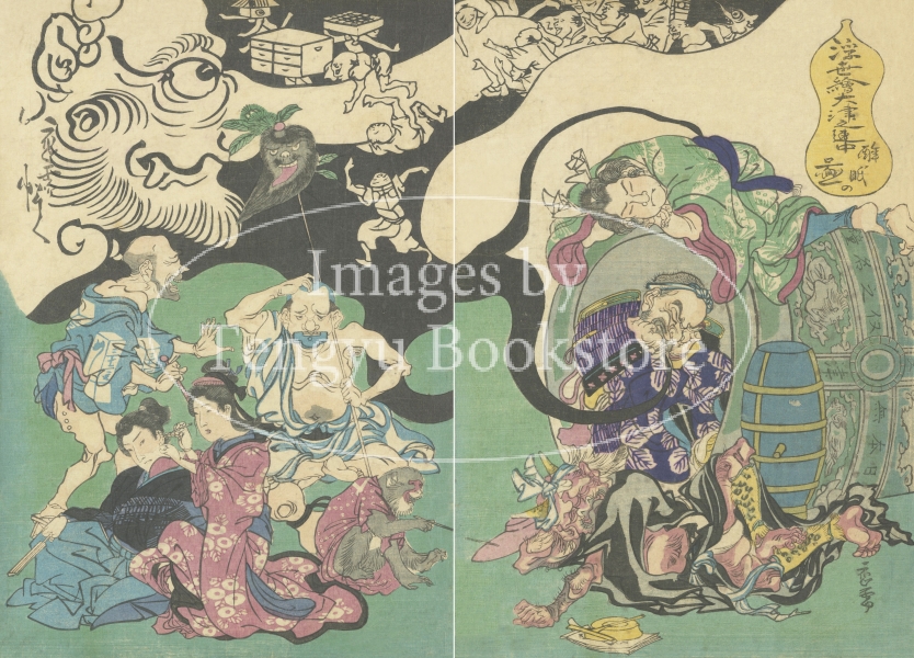優れた筆力と流派に留まらない独自の画風で海外でも人気の高い幕末-明治期の絵師、河鍋暁斎(1831-1889)の三枚続浮世絵「浮世絵大津之連中 酔眠の図」。