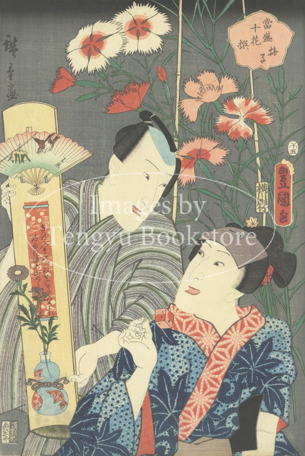 二人の歌舞伎役者を三代豊国が描き、背景に広重が季節の花を描いた合作シリーズです。