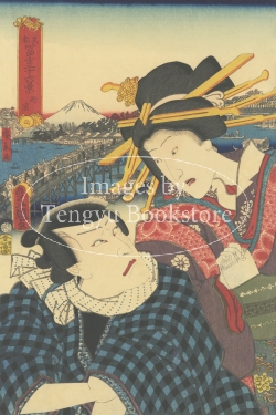 江戸時代後期を代表する浮世絵師のひとり 三代 豊国(歌川国貞:1786-1865)と、江戸時代後期の人気浮世絵師 歌川広重(1797-1858)による連作浮世絵「東都冨士三十六景」シリーズのうちの一枚。