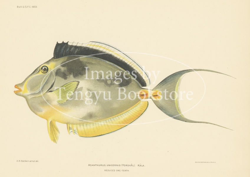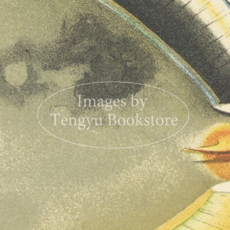 1907年ホノルルで刊行された「ハワイの魚類」の一図。ハワイに生息する色鮮やかな熱帯魚を、クロモリトグラフ(多色石版印刷)によって印刷した魚類小図鑑です。