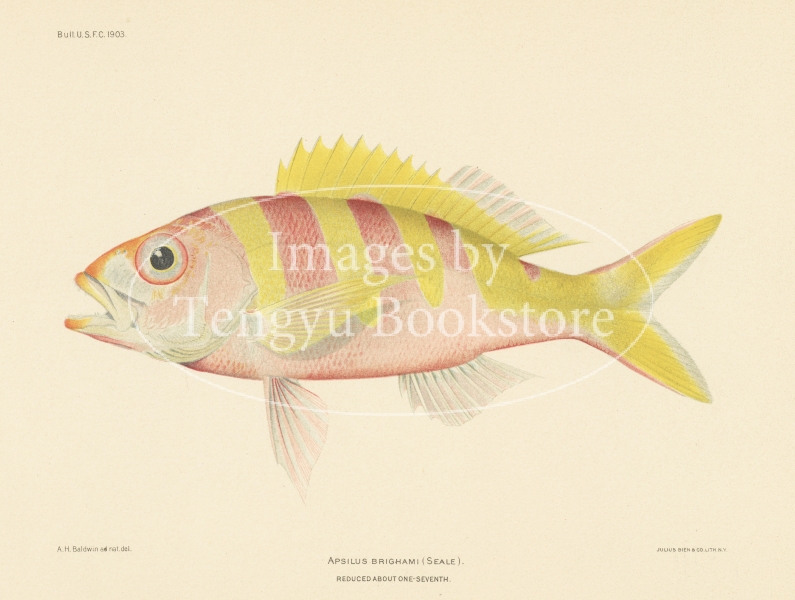 1907年ホノルルで刊行された「ハワイの魚類」の一図。ハワイに生息する色鮮やかな熱帯魚を、クロモリトグラフ(多色石版印刷)によって印刷した魚類小図鑑です。
