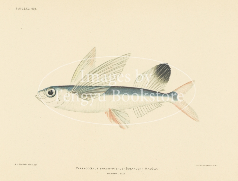 1907年ホノルルで刊行された「ハワイの魚類」の一図。ハワイに生息する色鮮やかな熱帯魚を、クロモリトグラフ(多色石版印刷)によって印刷した魚類小図鑑です。