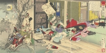 時事報道が禁じられていたため、旧幕府軍と新政府軍による鳥羽伏見の戦いを、戦国時代に羽柴秀吉と明智光秀が戦った山崎の合戦に偽装して描いています。